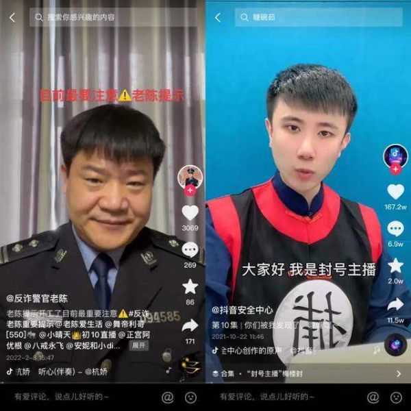 另外,还有一批以个人魅力吸引粉丝的偶像派蓝V,比如“反诈警官老陈”,背后代表的是他所在的打击治理电信新型违法犯罪中心,通过他个人的形象出镜宣传国家反诈中心APP走红网络,直播PK的在线观看人数超过了3800万。同类型的蓝V主播还有抖音安全中心的“梅楼封”等等。
