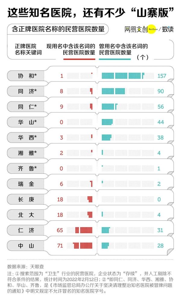 为此,2021 年 2 月,国家市场监督管理局发布文件,要逐一核查并清理使用“协和”“华山”“同济”“华西”“湘雅”“齐鲁”“同仁”等知名医院字号的民营医疗机构 [3]。