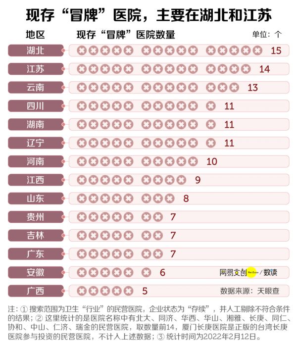 从地域来看,现存的冒牌医院主要分布在湖北、江苏和云南。