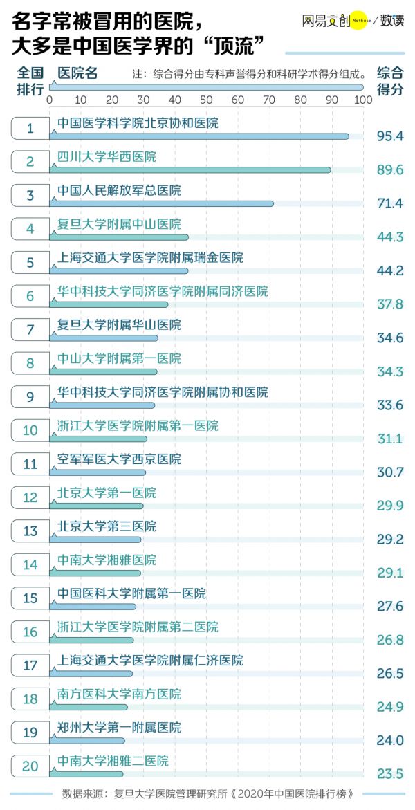 除了“协和医院”之外,常被冒名的四川大学华西医院、复旦大学附属华山医院等医院也常年处在中国医院榜单前列 [6]。
