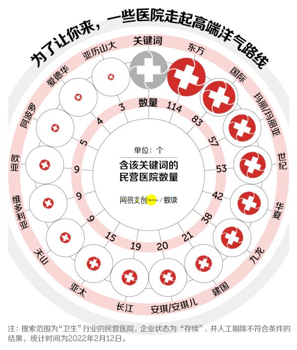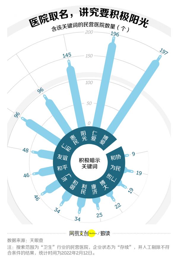 我们分析了天眼查中近 3 万家民营医院后,发现医院取名其实就像给新生儿取名一样有着明显的偏好。“民”“康”“安”“信”“爱”“美”等是民营医院取名最爱的字眼。