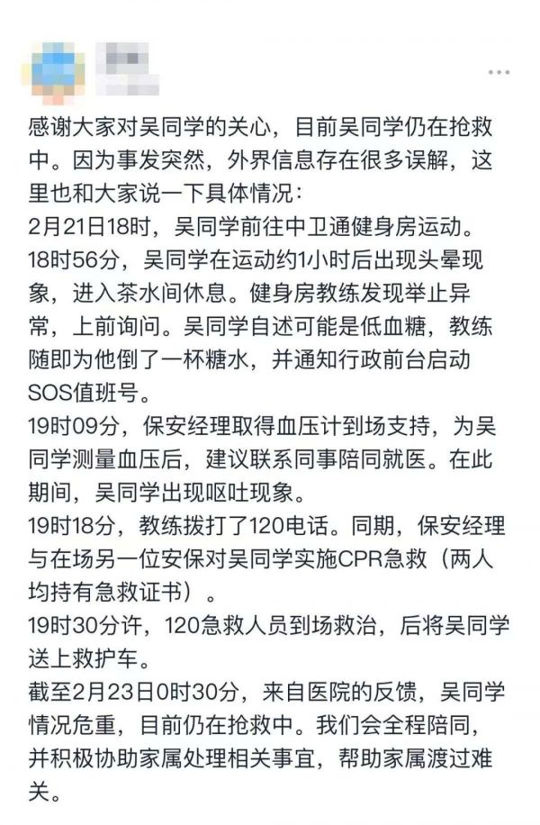 截图上称,吴同学在2月21日18点进入中卫通健身房,健身将近一小时后出头晕现象,进入茶水间休息,自述有可能是低血糖现象,教练为他倒了一杯糖水后,通知行政前台启动SOS值班号。19点09分,保安经理取得血压计并为其测量期间,吴同学出现呕吐现象。19点18分,教练拨打了120电话,安保实施cpr急救。19点30分急救人员到场。2月23日0时30分时,吴同学仍在医院抢救中。