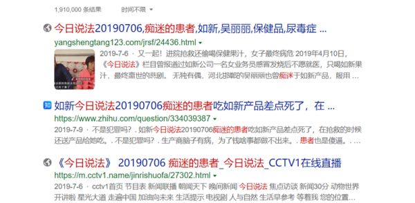 央视《今日说法》栏目也曾在2019年报道过该事件,在2019年7月的节目介绍中用痴迷两个字表示如新的使用者。节目中因轻信如新保健品,重症缠身要做血液透析,几乎是从鬼门关抢回条命。