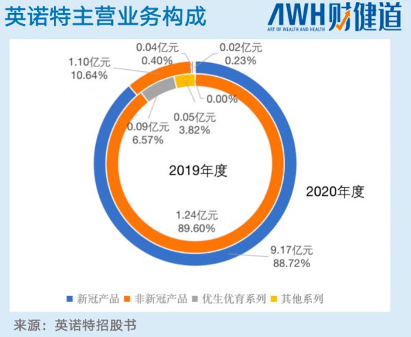 从2019年到2020年,英诺特主营收入由1.3亿上升至10.33亿,增幅接近7倍,且2019年,整个营收产品布局中,呼吸道产品占89.6%,而进入疫情的第一年 (2020年) ,新冠检测产品就占主营收入的88.72%,也意味着它高度与新冠疫情捆绑。