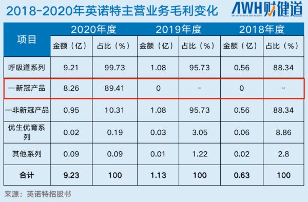 2020年之前,仅有221人的英诺特还只能算一个小微企业,一年的毛利到2018年只能拿到6309万人民币,但到了2020年英诺特有了名头,国家药品监督管理局紧急审批,英诺特的新冠产品获得国内首批新冠病毒IgM/IgG抗体检测试剂盒注册证,而新冠疫情在当时已成为全球性的公共卫生问题,疾病快速蔓延,市场的需求量也随之增加,仅2020年一年,英诺特全年毛利达9.2亿,其中新冠产品达8.3亿,占总量的89.41%,在总毛利上,相比于2019年翻了近9倍。