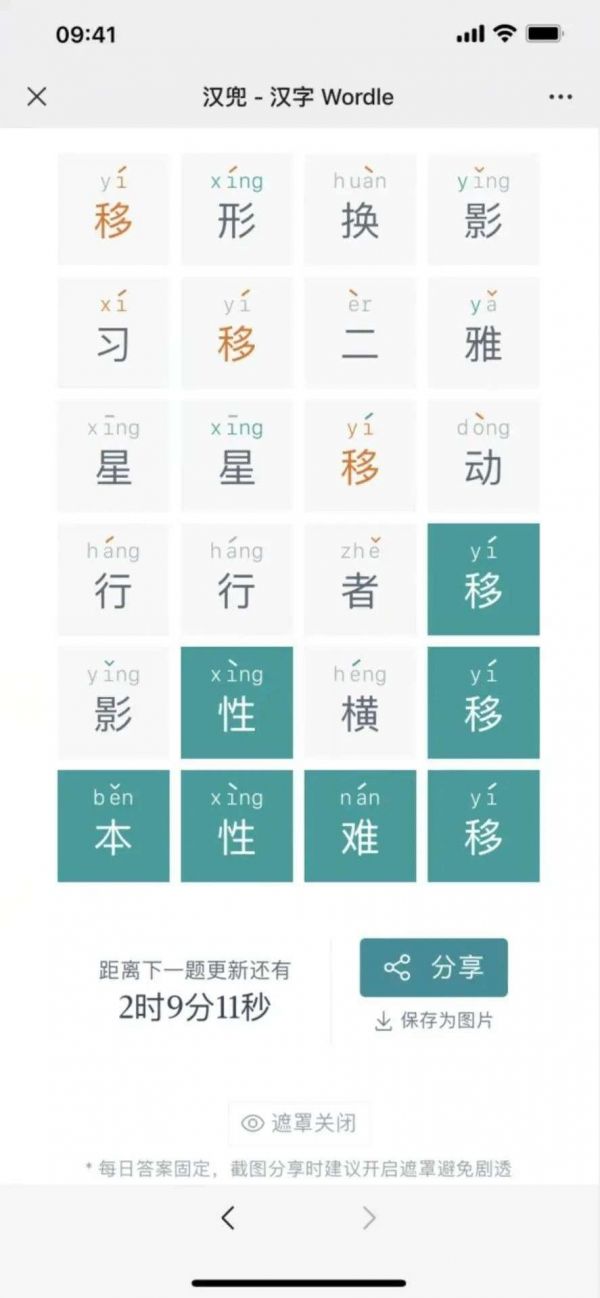 在通关后,你可以将自己今天挑战的结果保存成图片分享出去,鉴于游戏的答案在每日 00:00 刷新,为了避免剧透建议将自己的图片添加遮罩,满足分享欲的同时减少对他人的困扰。