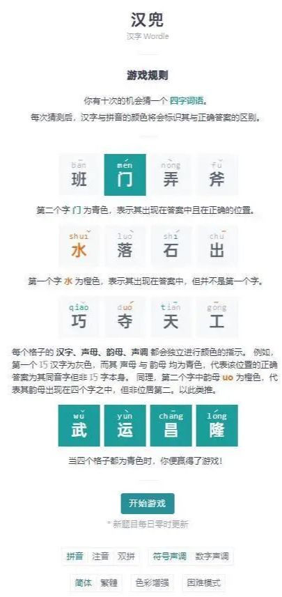 在规则上,《汉兜》也与 Wordle 类似,将所想的四字词语填入框内,玩家就可以知道这个文字的位置是否准确,全部准确即为挑战成功。在准确度的表示上,《汉兜》也与 Wordle 一样使用三种颜色来表示: