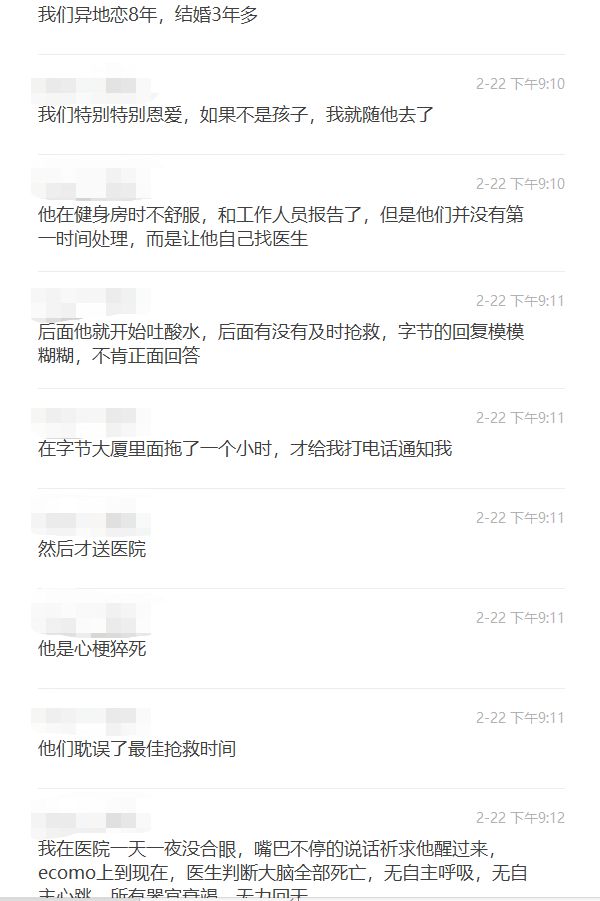 她在群聊中自述,吴同学在健身房时不舒服,和工作人员报告了,但是他们并没有第一时间处理,而是让他自己找医生。吴同学开始吐酸水后,有没有及时进行抢救,对此字节的回复模模糊糊,并未正面回复。“在字节大厦里面拖了一个小时,才给我打电话通知我。后面才送医院。”她还表示。
