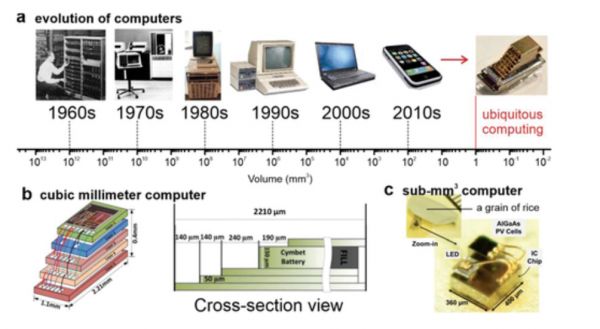 事实上,在 2013 年,计算机尺寸已缩小到 1 立方毫米,它是通过将灰尘大小的芯片(包括中央处理单元、存储器、电源管理电路和定时器 )堆叠成一个矩形堆叠而成的。最终用户可以通过添加应用层(例如温度传感器)来创建传感器系统。