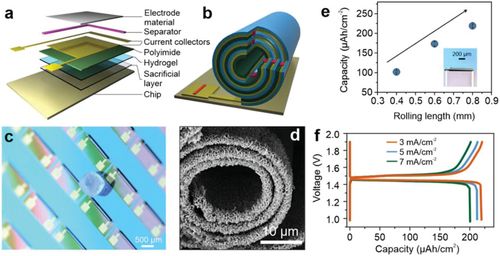 论文显示,研究人员使用类似“瑞士卷( Swiss-roll ) ”或“微型折纸”工艺。通过将聚合物、金属和介电材料的薄层连续涂覆到晶片表面上来创建具有固有张力的分层系统。机械张力通过剥离薄层来释放,然后自动弹回以卷成“瑞士卷”结构。因此,不需要外力来制造这种自绕式圆柱微型电池。该方法与比较成熟的芯片制造技术兼容,并且能够在晶圆表面上生产高产量的微电池。