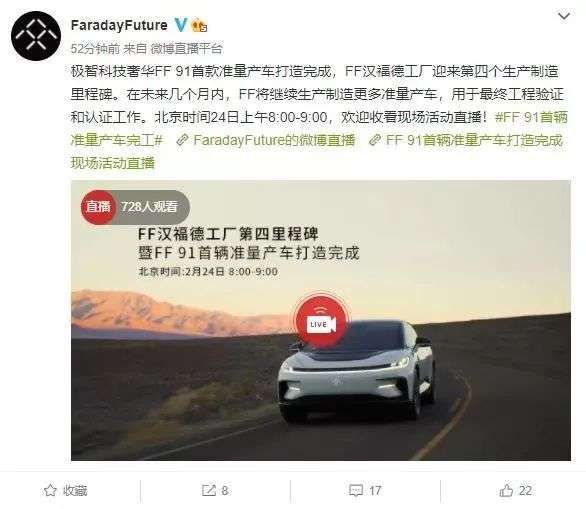法拉第未来宣布FF91首款准量产车打造完成 ,未来几个月将完成工程验证和认证