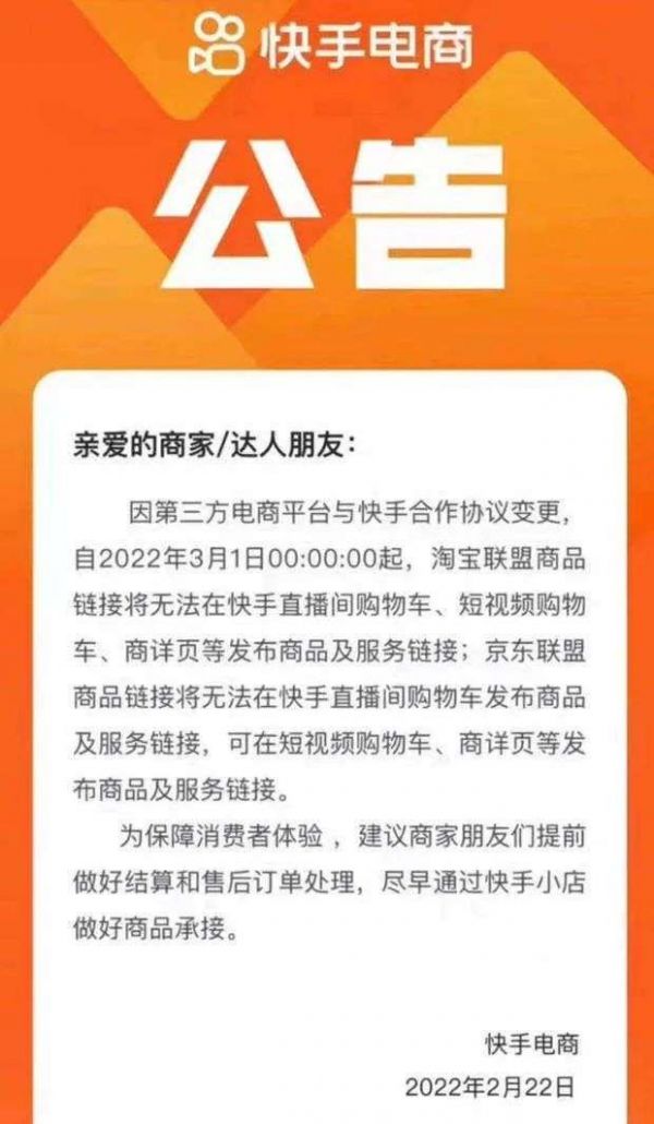36氪获悉,快手电商发布公告称,因第三方电商平台与快手合作协议变更,自2022年3月1日0时起,淘宝联盟商品链接将无法在快手直播间购物车、短视频购物车、商详页等发布商品及服务链接;京东联盟商品链接将无法在快手直播间购物发布商品及服务链接,可在短视频购物车、商详页等发布商品及服务链接。