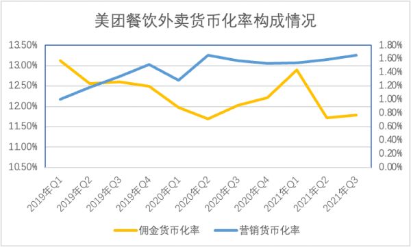 从货币化的构成角度去看,就发现了其中秘密:餐饮外卖总货币化率在过去三年时间变化不大,这也暗示餐饮业对美团的“容忍度”已经接近饱和,但出于营收质量考虑,美团外卖开始调整商业结构,降低佣金的权重,提高广告营销类收入占比,以较为“怀柔”的手段与餐饮业合作。