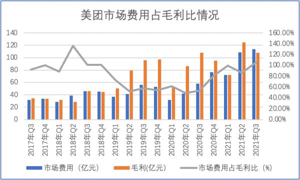 美团最初通过两头补贴的形式快速成长(对商家和用户),在市场占比以及规模日臻成熟之后降低市场费用,以扭亏为盈,这也是此轮消费类互联网的主要做法,但同时也发现,2020年之后美团市场费用又重新上扬,2021年Q3甚至吃掉了所有毛利。