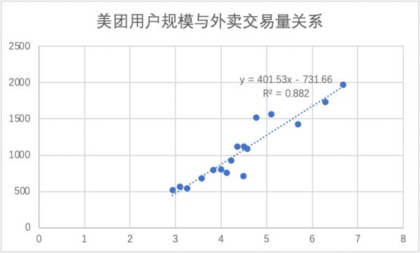 在上图中,我们将美团用户规模与外卖交易额进行拟合处理,发现的两者呈高度相关性,如果要确保外卖规模的持续增长,就必须要稳定用户大盘的增速,而在最近几个季度,点状分布是有向拟合线下转移的迹象。