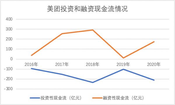为证明融资能力对业务的重要性,我们又整理了美团融资和投资性现金流情况,见下图