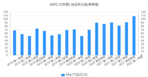 不过在公司硬件业务中,iPhone的营收增速却并不突出。对比看,除了因为芯片供应问题出现营收下滑的iPad产品之外,苹果其他硬件产品营收增速均高于iPhone产品同比增速。其中,Mac产品同比增长高达25%,单季度营收首次突破100亿美元大关。