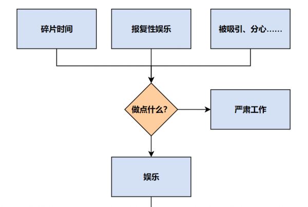 这样的选择排除个人兴趣因素,也是无奈之举。碎片时间一般都在 10-20 分钟,读书吧,读不了一会,前面的章节还没完全回忆起来就得放下手机;聊天吧,大家都挺忙的,万一等会抽不开时间,消息回复不及时,反而吃力不讨好;做点工作吧,多累啊,就这么几分钟能做点啥啊,还是算了吧。娱乐软件恰恰是看准了这样的时机,插入了我们的日常生活。