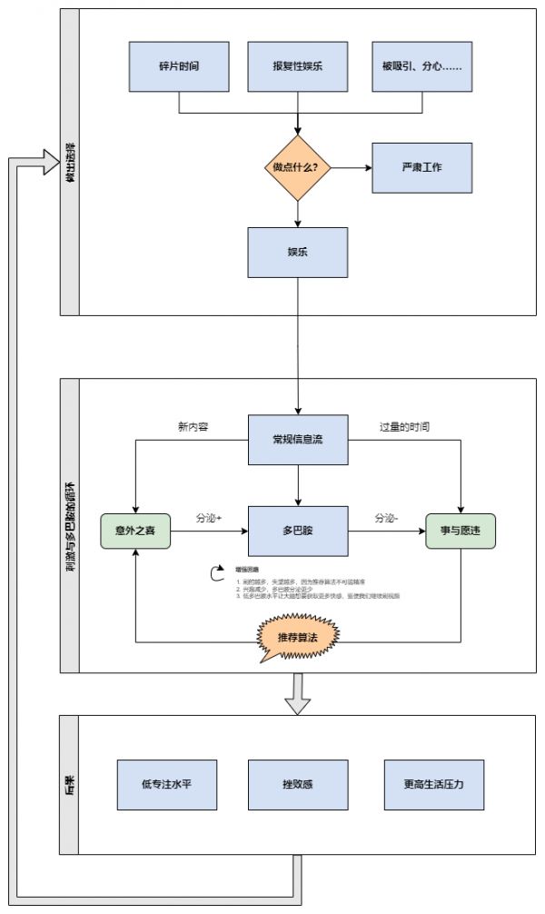 下图展示了我们如何被手机娱乐影响、并逐渐打破正常生活习惯的过程。其中大致可以分为三个部分:错误的选择、刺激与多巴胺的循环,以及上述行为的影响。