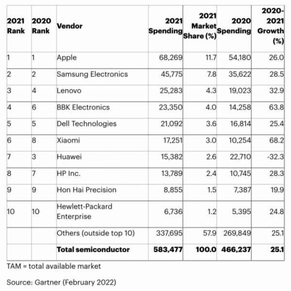 Gartner发布的2021年全球芯片购买量Top 10报告显示,2021年苹果以超过682亿美元的芯片采购量成为采购最多半导体的公司,三星以超457亿美元采购量位居第二。自 2011 年以来,苹果和三星电子一直保持着前两名的位置。