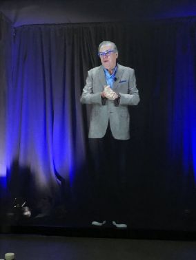 上周在旧金山举行的两个独立的演示活动帮助展示了实时投射到屏幕上的高度逼真的真人大小的视频资料。ARHT媒体的首席执行官Larry O'Reilly看起来就像在旧金山市中心的办公室里,而实际上他是在多伦多的一个工作室里。Portl公司的Nussbaum开玩笑地伸手去拿屏幕旁边的一个杯子,而Larry O'Reilly看起来像是要从全息投影设备中跳出来去抢走那杯酒。