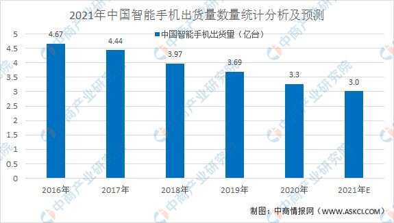 而反观手机行业,正处于规模下滑的态势。IDC数据显示,2016至2021年间,中国智能手机出货量呈现逐年下滑的态势,由4.67亿台下滑至3.0亿台。