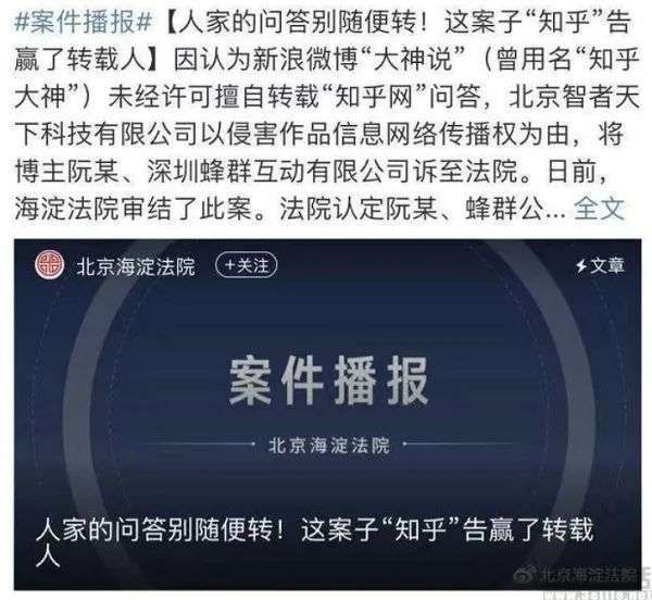 但面对这样的版权保护困境,也并非所有平台都会选择“视若无睹”。早在2016年,微博粉丝量超过500万的@知乎大神 由于未经许可擅自转载“知乎”中的相关内容,并以搬运这类内容吸引流量及广告商赚取收入,被知乎方面以侵害作品信息网络传播权为由诉至法院。