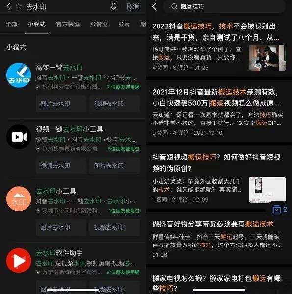 然而,目前为了牟利的专业搬运团队,显然并不太可能主动向原创作者申请授权,甚至还会剪切、涂抹、消除原内容中的水印。如今在问答平台及微信小程序等平台进行搜索,也不难发现类似“去水印小工具”以及“搬运技巧”的分享。