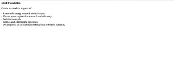 不过,马斯克基金会的网页只有短短几行字,只是列出了基金会的捐助方向,包括:可再生能源、太空探索、儿科医学、STEM理工科教育以及造福人类的人工智能。至于捐了多少,捐了哪些项目,一律没有显示。