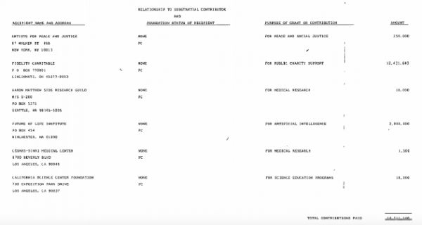 必须要说,马斯克的捐款并不都是为了慈善避税目的。2015年,非常关注人工智能技术前景的马斯克和几位富豪一道承诺捐赠10亿美元创建OpenAI人工智能研究公司,以便以“最有可能造福人类的方式”研究安全的人工智能技术。OpenAI也向美国知名高校的人工智能研究院提供资金和合作,麻省理工学院的未来生命研究院(Future of Life Institute)就获得了900万美元的资金。OpenAI并不是美国国税局认证的非盈利基金。