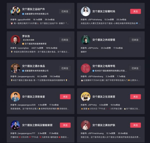 “交个朋友直播间和抖音的商业生态是一同成长起来的”,这是李亮对二者关系的定义,罗永浩本人的账号也在平台扶持下拿到了千万粉丝,迅速起量,但已经孵化了10个分品类账号的交个朋友,正在有意识地降低“含罗量”。