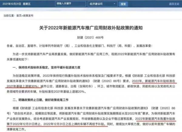 此前,财政部等四部委联合发布了《关于2022年新能源汽车推广应用财政补贴政策的通知》,明确了从1月1日起,新能源汽车的补贴标准在2021年的基础上退坡30%。