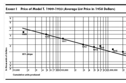美国历史上著名的福特T型车,从1909年到1923年的产量和价格变化曲线就非常完美的诠释了这一定律。