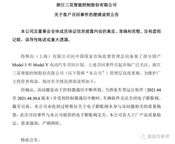 公告称,特斯拉召回事件主要是车辆控制器通信中断所致,与其电子膨胀阀本身没有关系。