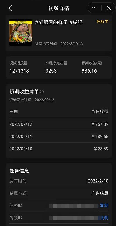 从刘玥分享给锌刻度的后台截图可以看到,她的爆火作品——一个带着“减肥后的样子”tag的视频,在2月10日发布过后,仅两天时间就收获了1271318次播放,连带着该视频捎带的小程序广告点击量也达到了3253次,直接为她带来986.16元的预期收益。