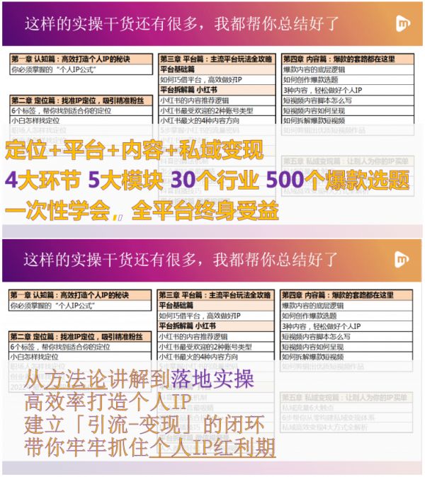 如果忽略这些颇具诱惑力的宣传语,据该训练营的所讲,他们针对个人IP的打造,已经找到了一个万能公式,即定位+平台+内容+私域变现,“我们最重要&明确自己的定位,可以帮别人解决什么样的问题,进而通过一些公域(抖音、小红书、知乎)等平台,发布一些对用户有价值、有份量的信息(普通人容易复制的心法),最后引导到私域(个人微信)实现变现,形成一个闭环”。