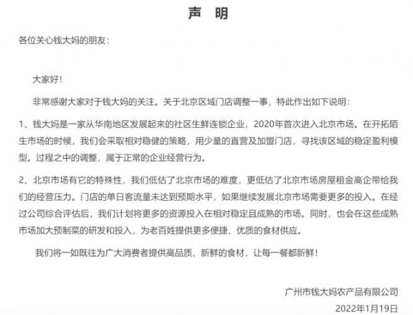 2022年1月19日,广州市钱大妈农产品有限公司发布了一份关于北京钱大妈区域门店调整的声明。