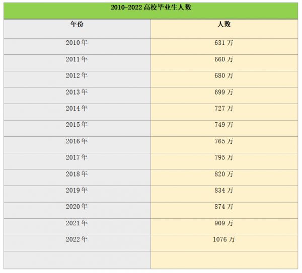 根据中国教育部的统计,2022年预计中国高校毕业生将达到1076万人,比2021年增长167万人,规模和数量均创历史新高。这也是年度毕业生人数首次突破千万大关。