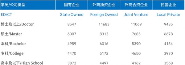 从上图可以看出,博士及以上学历的平均起薪最高,而在企业类型当中,外商独资业务和外商合资企业给出的平均薪资是相对高的。从薪资水平来看,基本与学历水平呈现正相关关系,也就是学历水平越高对应的起薪越高。这也一定程度上可以解释,现在越来越多的本科毕业生都推迟就业,继续深造的原因。这部分内容我们将在本文第二部分展开分析。