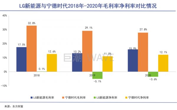 再拆开报表揉碎了看看,LG新能源与宁德时代的毛利率2018年到2020年三年分别为,17.5%、13.2%、15.9%和32.8%、29.1%、27.8%,净利率分别为0.1%、-5.1%、-3.6%和12.6%、11.0%、12.1%,LG新能源基本只有宁德时代的一半。