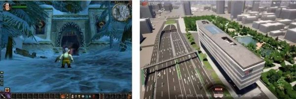 左图展示的是04年魔兽世界国服的界面,右图是智慧园区数字孪生全景图,其能够采用传感器和全景相机快速生成高精度模型,实现大量产业智能化应用。