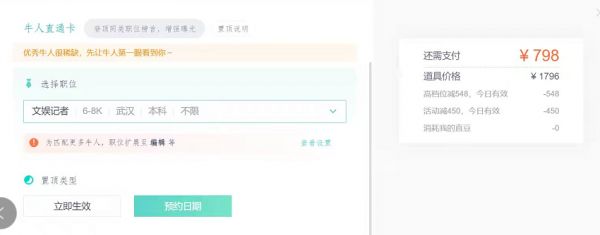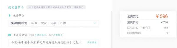 不过,这个“搜索置顶卡”价格也不便宜,仅仅一天的职位曝光时间就达到了596元。