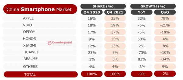 调研机构Counterpoint发布的中国手机市场报告显示,2021年第四季度,苹果超过vivo,以23%市场份额位居第一。这是苹果自2015年iPhone 6的巅峰之后,时隔六年再度拿下中国市场的季度销量冠军,大中华区更是成为苹果所有区域中该季度增幅最大的地区。