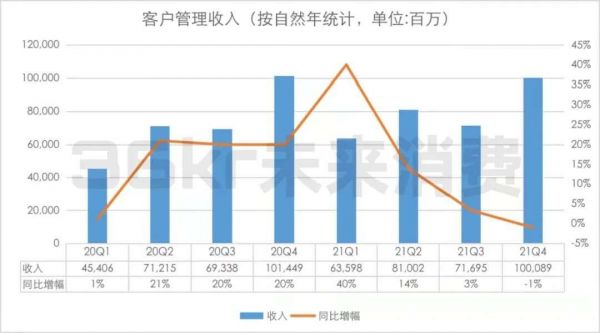以平台为定位,阿里的电商收入主要靠交易佣金和广告投放,财报中统称“客户管理收入”。但在2021年各季度,这项营收同比涨幅迅速下滑,分别为40%、14%、3%和-1%。