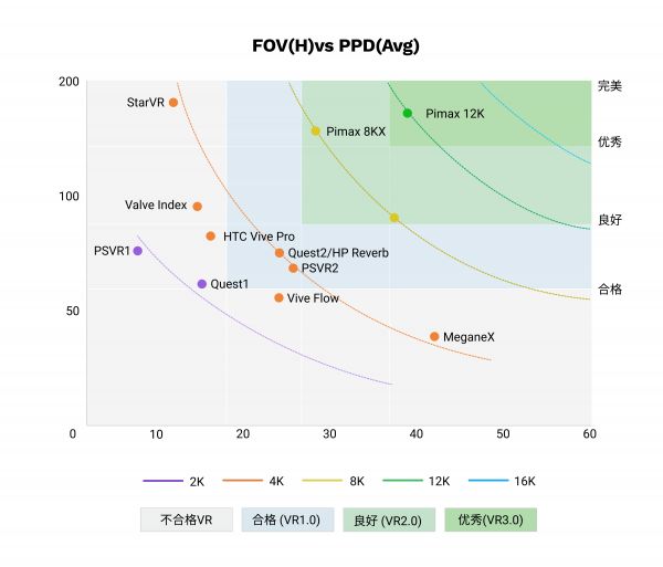 VR硬件越高端,性能越好,沉浸感越好。最重要的视觉沉浸感可通过UVI(Unit of Visual Immersion)这个指标来衡量。100%的UVI就意味着用户带上头显睁开眼睛,完全无法分辨,影响UVI的三大指标是PPD分辨率、FOV视场角和刷新率。其中60PPD代表了视网膜水平,水平220度代表了人眼自然视场角,大于180Hz人眼基本无法分辨,不易产生眩晕。三个指标都分别存在绝对的天花板水平,每个指标的实际值除以其天花板水平得到一个百分比就是在该指标上的得分,三个百分比的加权调和平均值就是UVI。这三个指标理论上是相互独立的,但是工程实践中并不是互不干涉的。