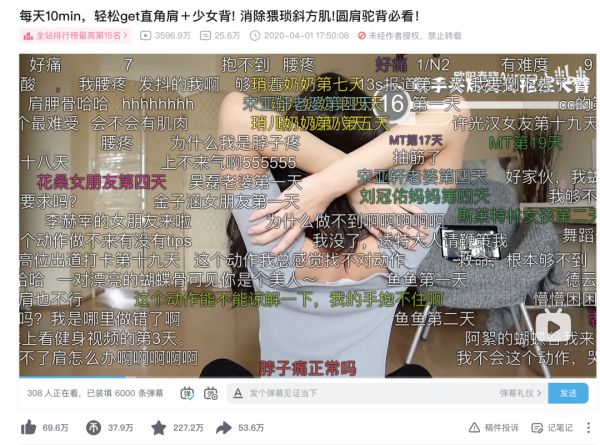 《2020 B站用户健身群像》报告显示,每天有超过570万人在B站观看健身类视频,其中19-30岁的用户占比接近70%。《2021 B站创作者生态报告》显示,当年B站体育创作者的规模增长了76%。周六野zoey、帕梅拉等UP主大受欢迎。奥运会期间,B站全民健身征集令的视频播放量超过2.5亿。