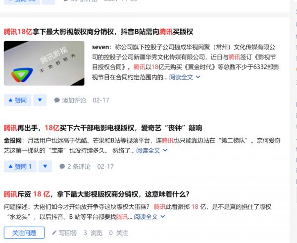这份公告也让捷成股份收到了来自深交所的关注函,要求捷成说明为腾讯开放的版权是否为独家、排他的性质等问题。25日,捷成股份发布的回复深交所关注函的公告,承认此前与腾讯的18亿影视版权合作中,授予腾讯的网络传播权是独家、排他的权利。对此,不少网友在社交媒体上表达了悲观态度——“砸钱垄断版权不是好事,一家独大对观众也不是什么好事”、“相同的故事,又要再来一次了”。