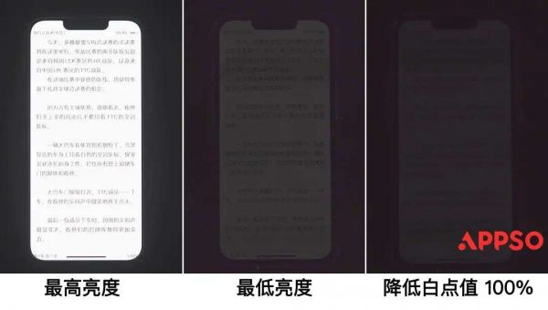 ▲ 在 iPhone 最高亮度、最低亮度、降低白点值 100% 的情况下效果对比