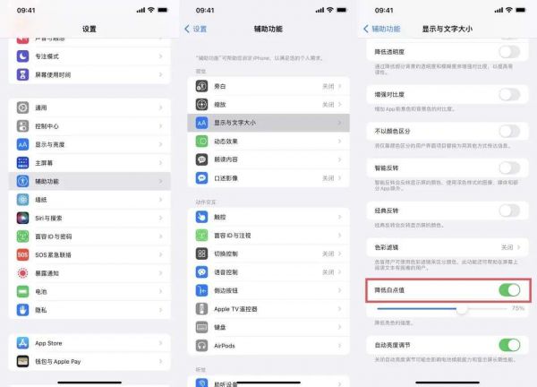 依次点击手机「设置 > 辅助功能 > 显示与文字大小 > 降低白点值」,屏幕亮度可得到有效降低。