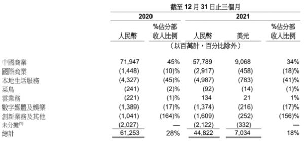 本财季开始,阿里将主营业务进行了重新划分,共分为中国商业、国际商业、本地生活服务、菜鸟、云业务、数字媒体及娱乐,以及创新业务及其他七大类。